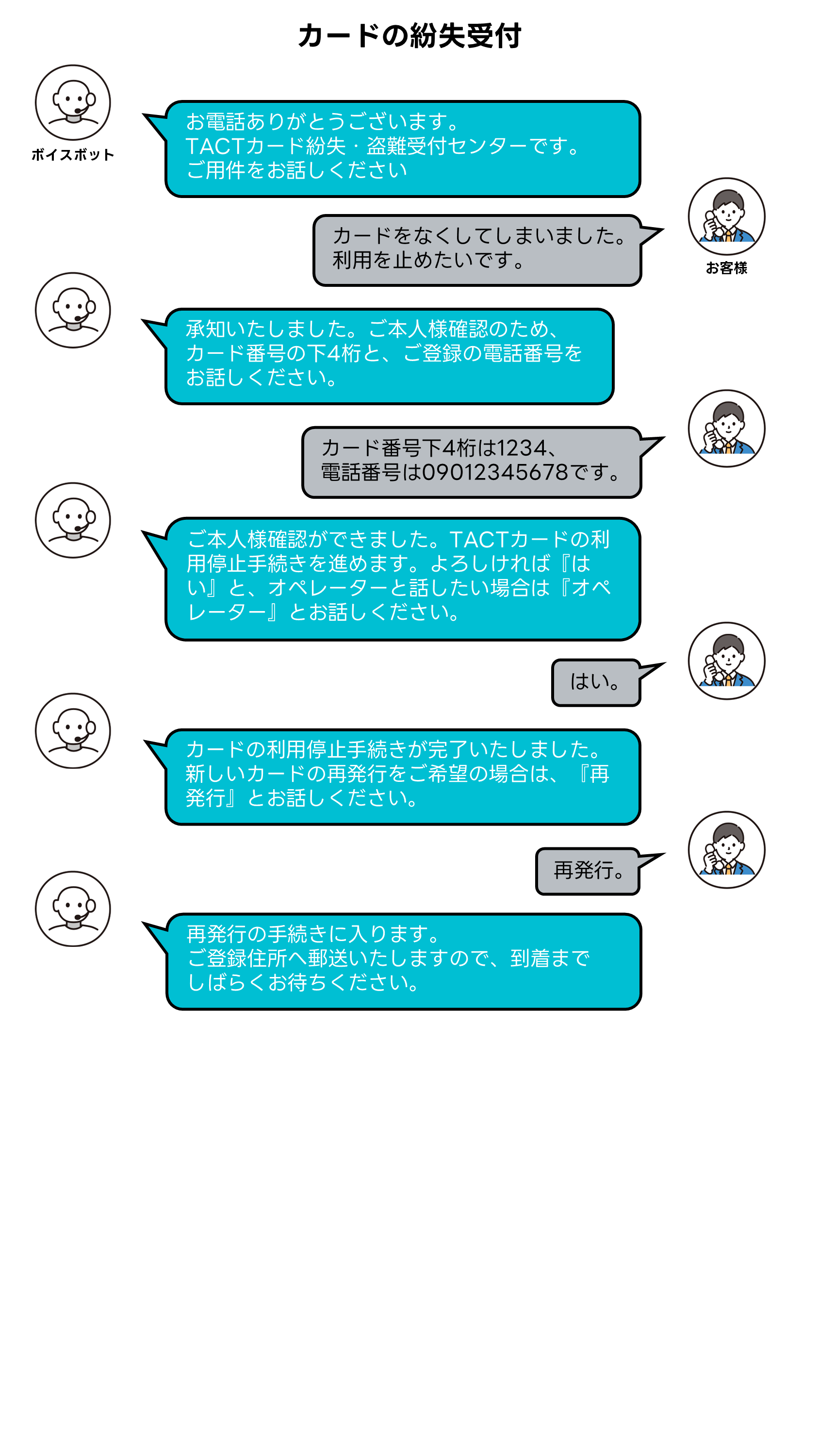 クレジットカード会社や流通系金融サービスにおいて、カードの紛失・盗難は顧客にとって緊急性の高い事案です。ボイスボットは、顧客からの電話で紛失・盗難の状況をヒアリングし、本人確認を行った上で、即座にカードの利用停止手続きを受け付けます。さらに、再発行手続きの案内や、場合によっては再発行手続き自体をボイスボット上で完結させることも可能です。これにより、24時間365日いつでも紛失連絡ができる体制が整い、オペレーターの営業時間外でも迅速な利用停止処理が可能となるため、不正利用リスクを最小限に抑えることができます。定型的な受付業務を自動化することで、オペレーターはより複雑な不正利用調査や顧客サポートといった、専門性を要する業務に集中できるようになります。