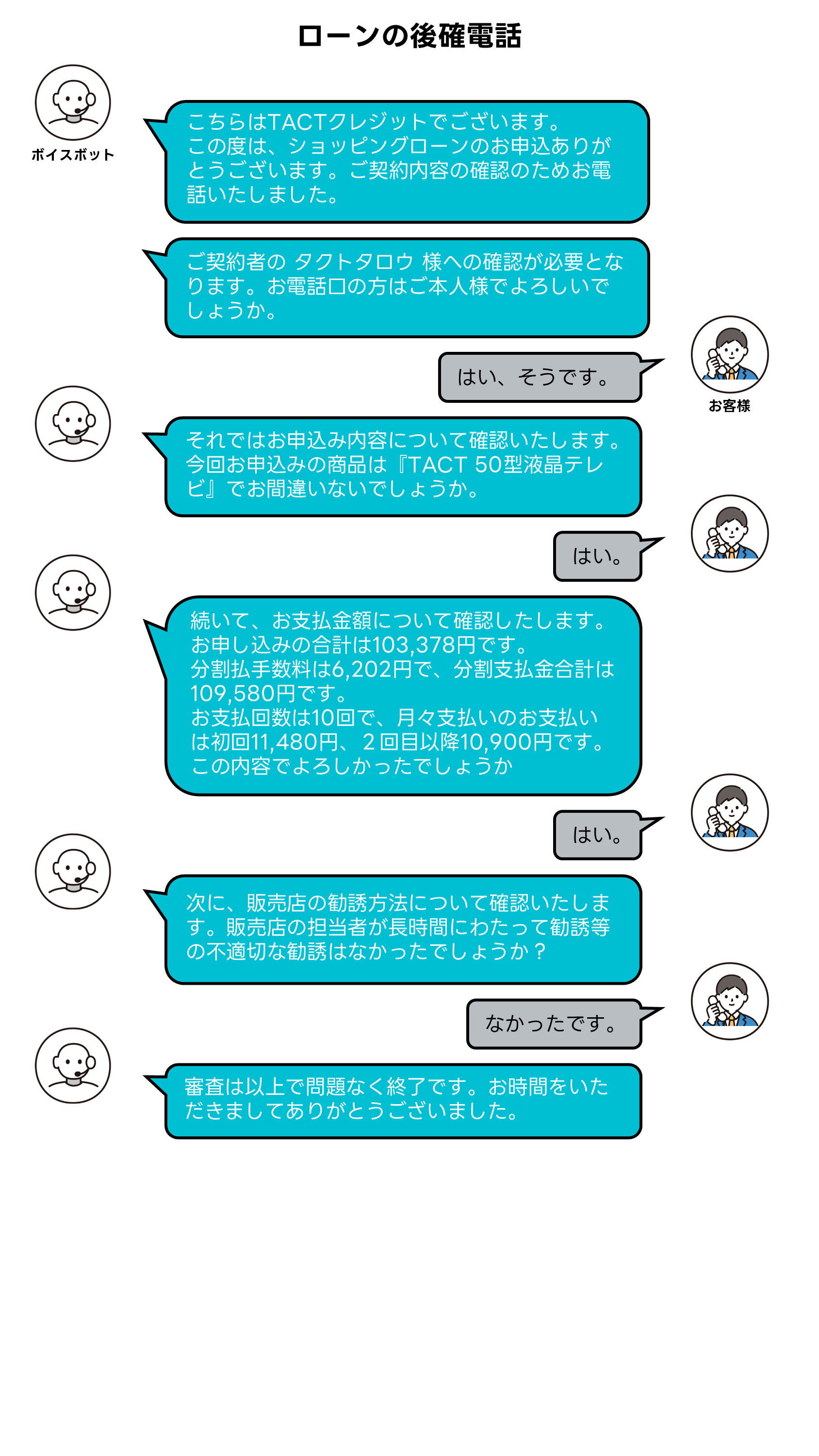 クレジットカードやノンバンクなどにおけるローン契約では、契約締結前に最終的な意思確認や重要事項の確認(後確)が義務付けられている場合があります。この後確電話業務においてボイスボットは、顧客に自動で発信し、本人確認を行った上で、契約金額、手数料、分割支払金、返済方法といった重要事項を音声で読み上げ、顧客からの同意を音声で取得し、その対話内容を正確に記録・保存します。これにより、膨大な件数の後確電話を自動化することで、オペレーターの業務負担を劇的に軽減し、契約締結までのリードタイムを短縮することが可能になります。また、音声ログや録音データを自動で取得・保存するため、コンプライアンス要件を確実に満たし、トラブル発生時の証拠としても活用できます。