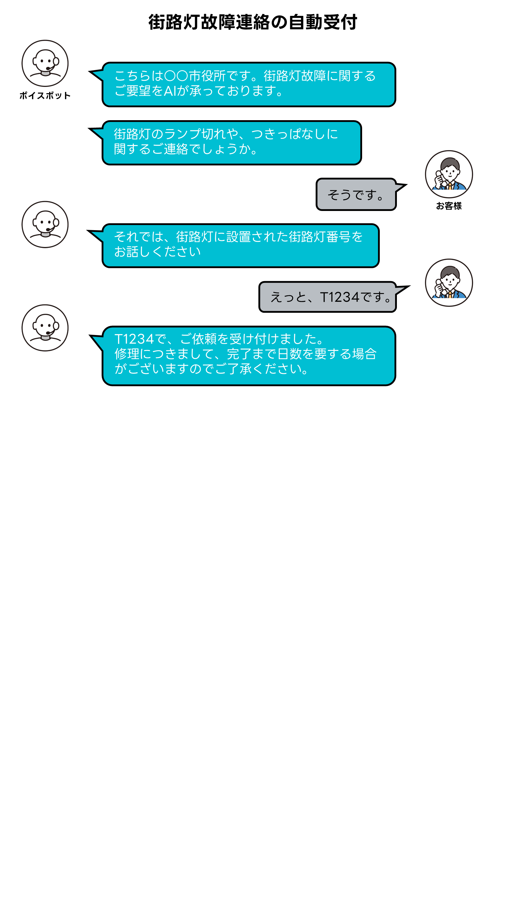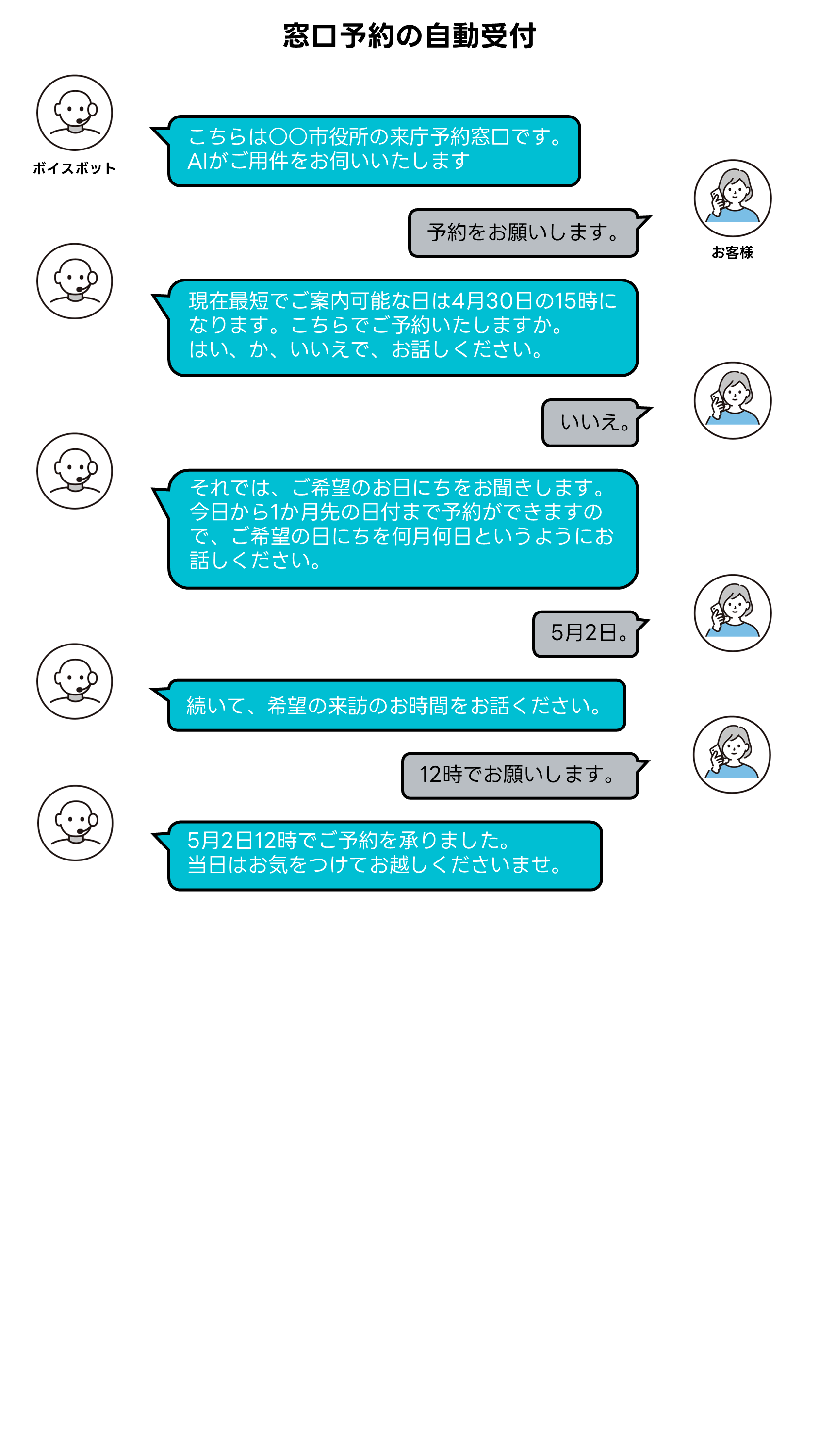 スマートフォンやインターネット操作に不慣れな高齢者や、視覚・聴覚に障がいを持つ方々にとって、音声で情報にアクセスし、行政サービスを利用できるボイスボットは極めて有効なツールです。昨今ではフロントヤード改革で、窓口予約が注目を集めていますが、これをボイスボットを連携させることで、電話口での音声操作だけで窓口の予約を完了させることが可能になります。これにより、ウェブサイトでの複雑な操作が不要となり、住民は自身の都合の良い時間にスムーズに来庁できるため、窓口での待ち時間短縮や手続きの円滑化に繋がります。誰もが行政サービスにアクセスしやすい環境を整備し、デジタルデバイドを解消することで、真に共に支えあえる平等な社会 の実現に貢献します。