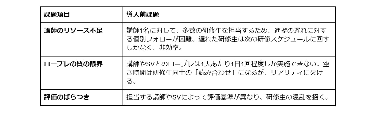 今までのお話をまとめると、AIロープレ導入前は下記のような課題があったということですね。