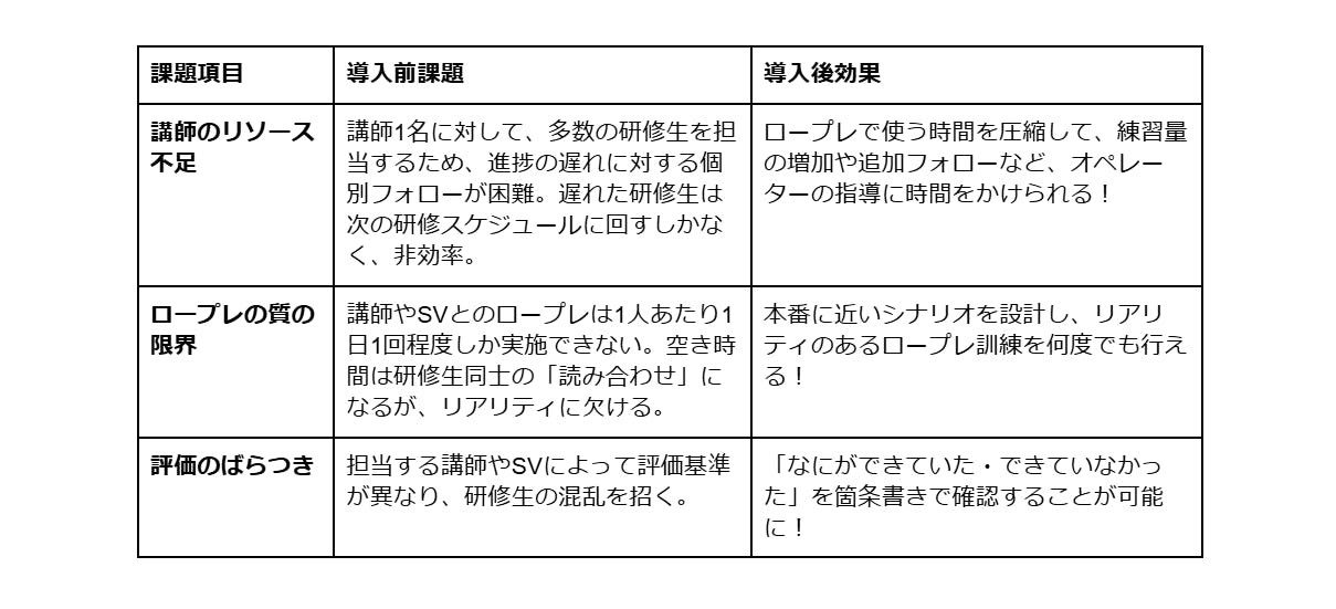 ということで、ここまでのインタビューを通じて、AIロープレ導入のビフォーアフターをまとめてみました。