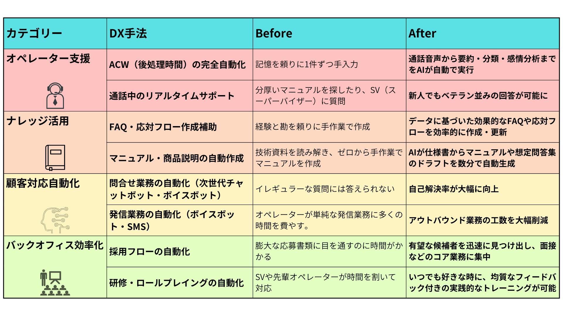 生成AIは、これらの「人」に依存してきた業務を自動化・高度化することで、オペレーターが本来注力すべき 「顧客との質の高いコミュニケーション」 に集中できる環境を創出します。